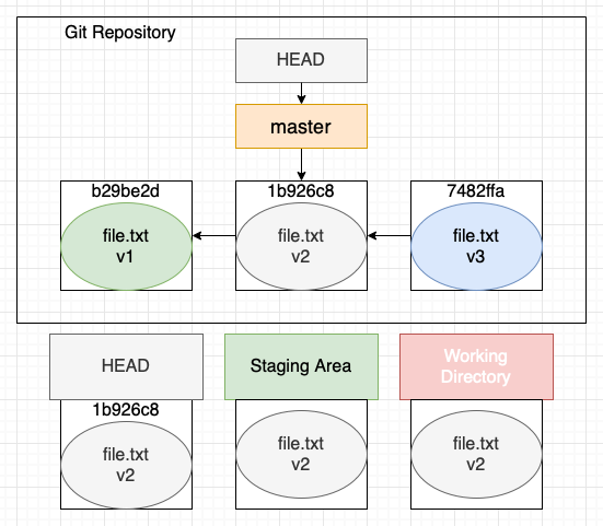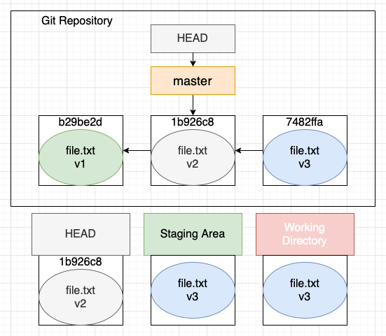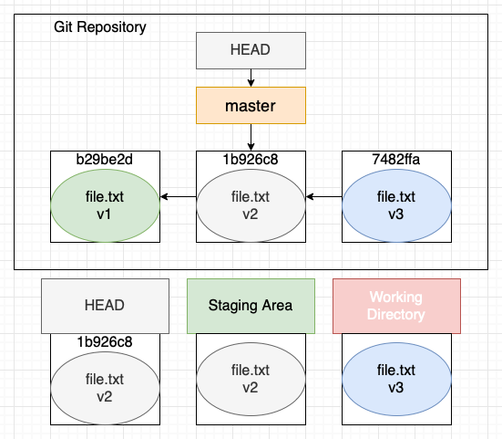 HEAD, Staging Area의 데이터가 바뀐다. 작업 중인 코드는 Working Directory에 남는다.