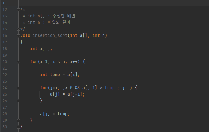 즉, 정렬되지 않은 부분의 첫 요소 위치를 저장해두고, 반복제어 변수(j)에 그 위치를 저장해둔 뒤에